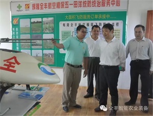 2015年3月11日,春耕農(nóng)資市場形勢分析會在海口隆重召開!會議期間中華全國供銷合作總社農(nóng)資局局長李殿平,副局長龍文及中華全國供銷合作總社各省級農(nóng)業(yè)生產(chǎn)資料公司領(lǐng)導(dǎo)一百余人參觀、考察海南輝隆全豐航空植保五一田洋統(tǒng)防統(tǒng)治服務(wù)中心,并參觀了飛機展廳,聽了工作人員對飛機的詳細介紹后,對農(nóng)用無人機的性能及優(yōu)越性有了更深的了解?! ‰S后又實地觀看中心飛防服務(wù)隊用無飛機防治豆角斑潛蠅的現(xiàn)場作業(yè),對全豐航空植保無人機***的性能,高度的智能化和作業(yè)效率給予高度贊同! 海南輝隆全豐航空植保通過在熱帶作物區(qū)域兩年的實驗示范,已經(jīng)形成了標(biāo)準(zhǔn)化的飛防作業(yè)體系和完善的飛防服務(wù)方案,為熱帶作物區(qū)的農(nóng)業(yè)全程機械化做出了巨大的貢獻!